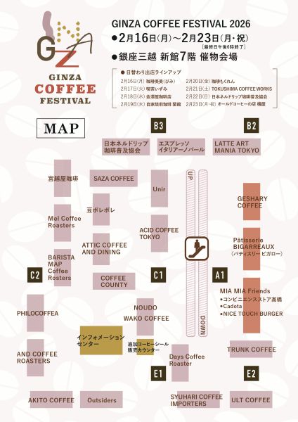 銀座三越は、2026年2月16日(月)~23日(月・祝)までの期間、新館7階 催物会場にて日本のコーヒーカルチャーの現在地を体感できる祭典『GINZA COFFEE FESTIVAL 2026』を初開催します。喫茶文化の名店から現代のスペシャルティロースターなど、コーヒーにまつわるスペシャリスト達が全国から33ショップ(1日限定出店を含む)集結し、ネルドリップやイタリアンエスプレッソといった職人技の実演、飲み比べ、フード&スイーツをご提供します。銀座=喫茶文化の発祥地において、日本のコーヒーカルチャーが凝縮された8日間です。