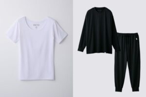 左)Uネックインナー半袖【女性用】3960円、右)スリープ プルオーバー長袖【男女兼用】7700円、スリープ ジョガーパンツ【男女兼用】7700円