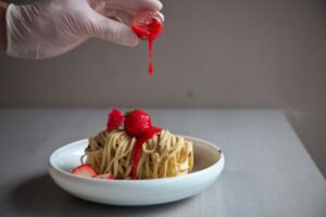 和栗白露によるイートインカフェが今年も登場!一緒に味わえるのは打越町で栽培された茶葉で作った加賀棒茶は、苦味と渋味が少なくほのかな甘みがします。落ち着いたカウンター席で至極のスイーツとドリンクをお楽しみください。こちらは和栗と苺のモンブランプレートで、契約農家からの和栗美玖里と苺を贅沢にひとつのお皿に盛り合わせました。