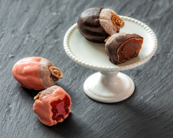 市田柿にフランボワーズガナッシュを詰め、ホワイトチョコをコーティングした「木苺」と信州伊那栗のペーストと栗焼酎のガナッシュを詰め、ビターチョコでコーティングした「栗」の詰め合わせ。