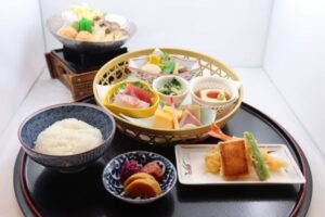 本鮪と色とりどりの具材を使った宝石箱のようなばらちらし。国産牛の石焼の2つのメインが楽しめる御膳です。