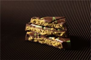“ドバイチョコレート”とは、板チョコの中にピスタチオとカダユフをフィリングしたチョコレートです。濃厚なピスタチオクリームと、サクサクしたカダユフの食感が楽しめ、ユニークな板チョコとして話題になっています。