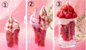 「札幌やおきゅう」①春いちごパフェシングル(1個)990円、②春いちごパフェダブル(1個)1320円 ③わや盛り春いちごパフェ(1個)1980円[各日販売予定数20]