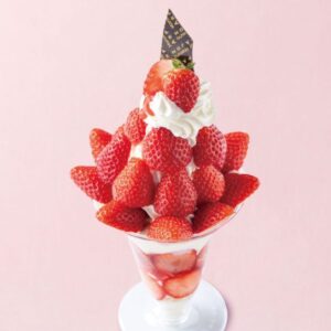 店舗は震災から5年後に移転・再開を果たしました。被害を受けて再建した山元町の燦燦園(さんさんえん)のいちごを使用したパフェです。