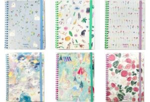 “新感覚やわらかリング”ノート。平らに開いて書きやすく、折り返して狭い場所でも快適。手が当たりにくくバッグの中で他のアイテムも傷つきにくい設計。高知県発の紙雑貨店「Paper message(ペーパーメッセージ)」とコラボしたロフト限定柄も販売。