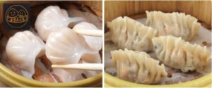 左)ぷりぷり海老蒸し餃子(5個)972円 右)具だくさん贅沢フカヒレ餃子(5個)972円