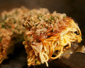 大阪なんばで4代続くお好み焼屋。生地の旨みとソースの旨みにボリュームたっぷりの麺がのった重層的な食感が特徴です。