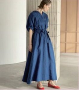 ヘリンボーンリネンを使用した上品なワンピース。袖口のギャザーやウエストリボンなどのディテールが魅力。