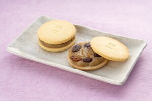 チーズサブレにチョコレートと白雪大納言小豆餡を重ね、ラム酒漬けレーズンとレモンピールを合わせました。