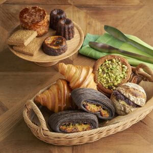 <Boulangerie S.Igarashi/ブーランジェリー エス・イガラシ>×<es feuilletage/エスタージュ>手前/手前から時計回り:パンスイス 605円、クロワッサン 454円、ピスタチオエスカルゴ 605円、あんバターサンド 832円(各1個、いずれも日本製)、奥/手前左から時計まわり:バターサブレ 313円、クイニーアマン 702円、カヌレ 389円、ファーブルトン 432円(各1個、いずれも日本製)