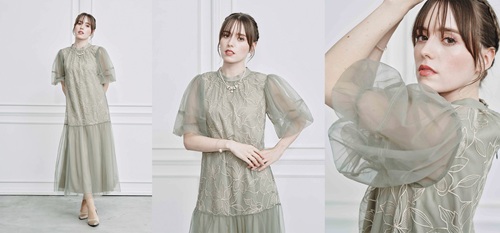 袖は柔らかいチュールを使用したパフスリーブで二の腕をカバーをしつつ上品な印象に。