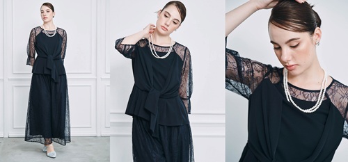 柔らかいシフォンジョーゼットと繊細なフラワーラッセルレースを組み合わせたブラウス・パンツのセパレート2点セット