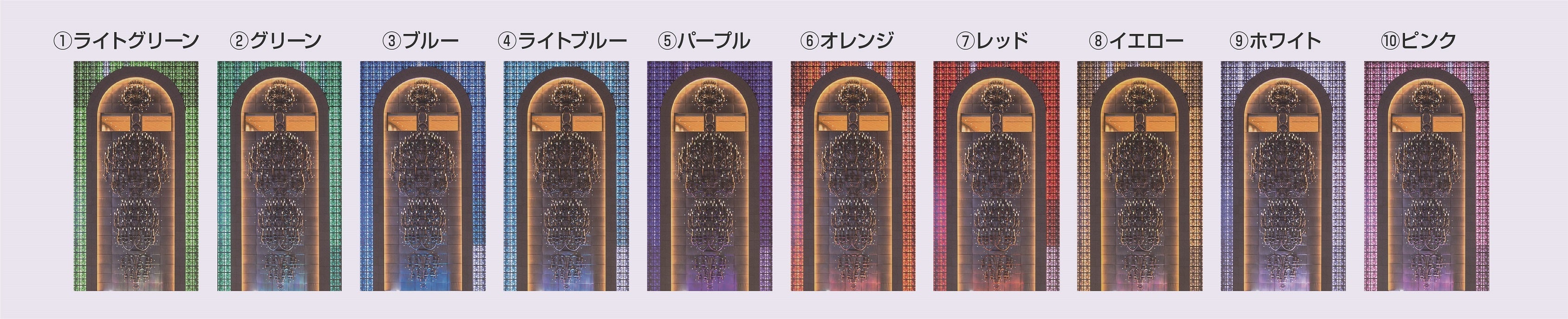①ライトグリーン ②グリーン ③ブルー ④ライトブルー ⑤パープル ⑥オレンジ ⑦レッド ⑧イエロー ⑨ホワイト ⑩ピンク